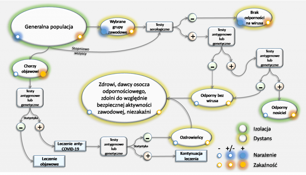 Każdy z rodzajów dostępnych testów ma pewne zastosowania, a ich użycie według logicznego planu miałoby znaczenie nie tylko dla pozyskiwania najwartościowszych informacji epidemiologicznych i klinicznych, ale pozwoliłoby również zaoszczędzić środki, które mogłyby być znacznie lepiej wydane na walkę z COVID-19. Poniższy schemat przedstawia szczegółowo ciąg postępowania diagnostycznego w różnych sytuacjach klinicznych i dla różnych grup zawodowych. Jego aktualność może się nieco zmieniać z czasem. Choćby już obecnie przechodzimy od samoizolacji do dystansowania społecznego.